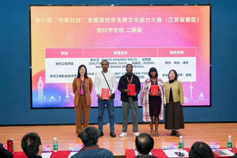 10月26日,第八届“外教社杯”全国高校学生跨文化能力大赛江苏省赛区比赛圆满落幕。我校由来自刚果金的高大卫、赞比亚的达利索和赤道几内亚的玛丽亚组成的团队,在韩宇老师指导下,荣获国际学生组二等奖。
