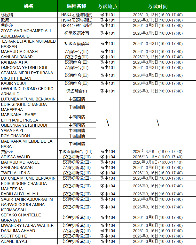 本次期末考试集中安排时间为:2025年3月3日至3月6日(具体各科目考试时间、地点详见下表的《期末考试安排表》),请需要补考的同学根据下表确认个人具体考试安排。