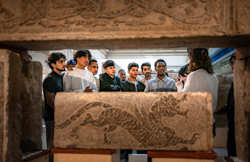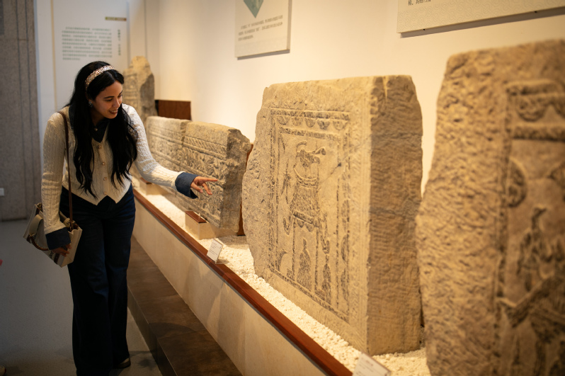 徐州汉画像石艺术馆藏精品画像石500余件,每一块画像石上都镌刻着汉代的社会风貌、生活习俗与文化信仰,是中华传统文化的重要载体。活动现场,讲解员结合历史典故,为留学生讲解汉画像石的历史背景与文化内涵。从车马出行、乐舞百戏的热闹场景,到农耕渔猎、宴饮会客的生活百态,再到神话传说、祥瑞图案的精神寄托,浅浮雕的阳刚之气与阴刻线的阴柔之美交相辉映,汉代生活跃然石上。来自阿尔及利亚的留学生穆航一边聆听讲解,一边感叹:“这些刻在石头上的故事真有意思,还有吃烧烤的画面,让我觉得自己离汉代很近,对‘两汉文化看徐州’有了更真实的感受。”