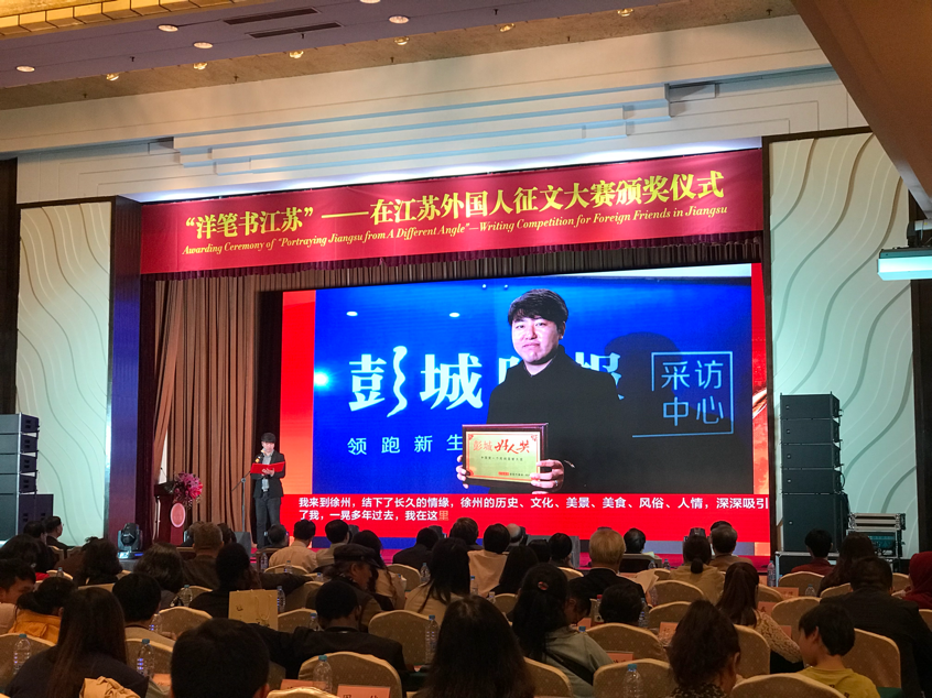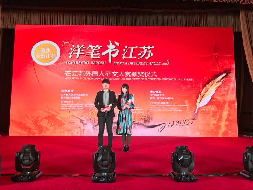 由江苏省人民对外友好协会与新华报业传媒集团共同主办的“洋笔书江苏”——在江苏外国人征文大赛颁奖典礼于4月3日下午在南京举行。省人民对外友好协会会长柏苏宁,新华日报社社长、总编辑、党委书记,新华报业传媒集团董事长双传学,省作协主席范小青致辞,江苏省政协副主席胡金波及有关领导为获奖选手颁奖,参加征文大赛的部分外国友人与数百中外人士一起参加了颁奖仪式。